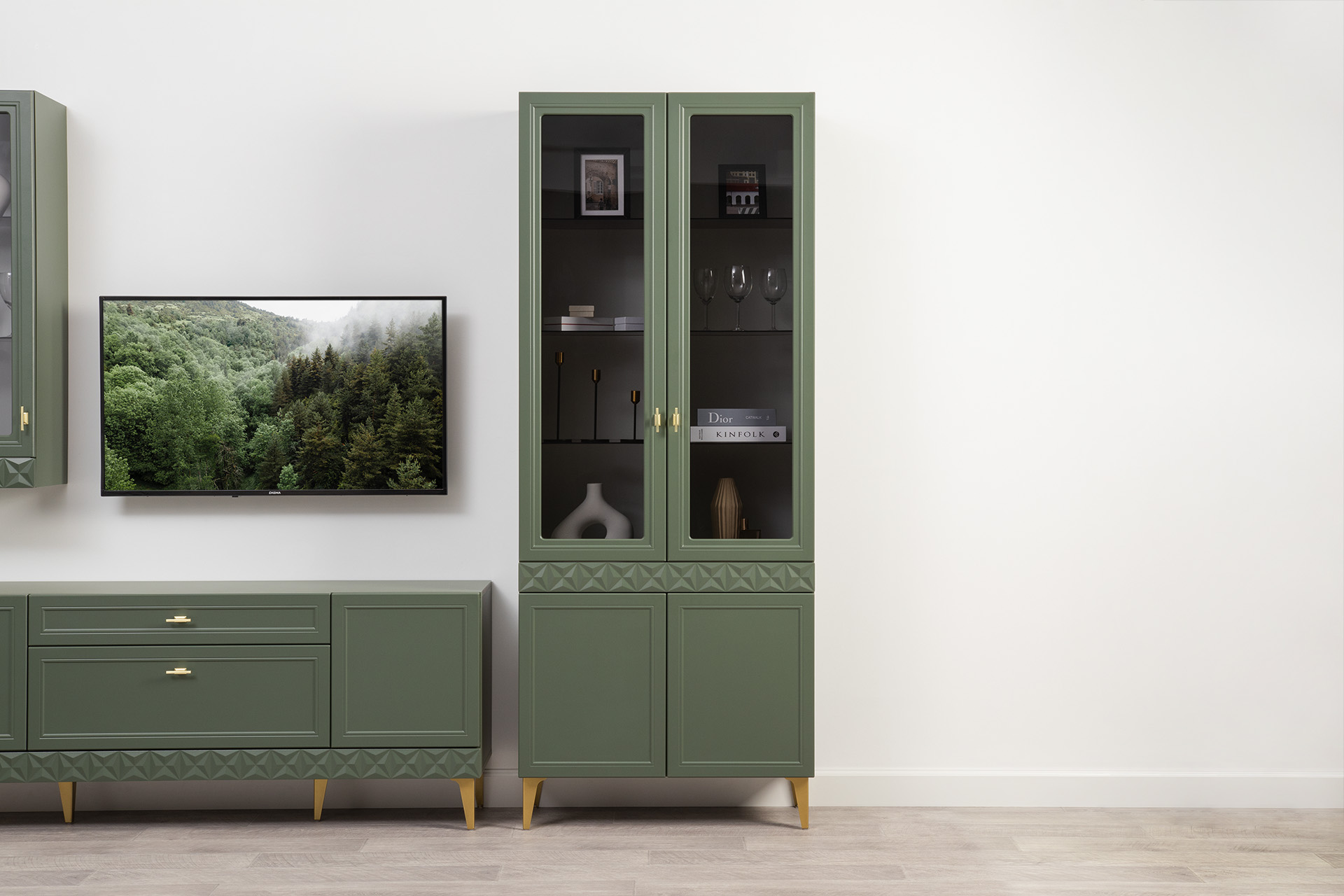 Гостиная Марион композиция 2 дымчатый зеленый K521, олива шагрень AG 1050 ПВХ, белый PE шагрень (собирается на любую сторону)