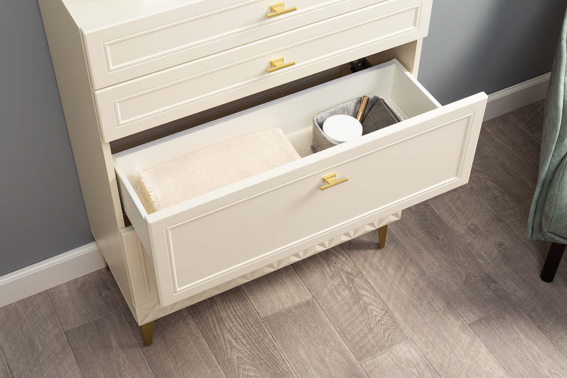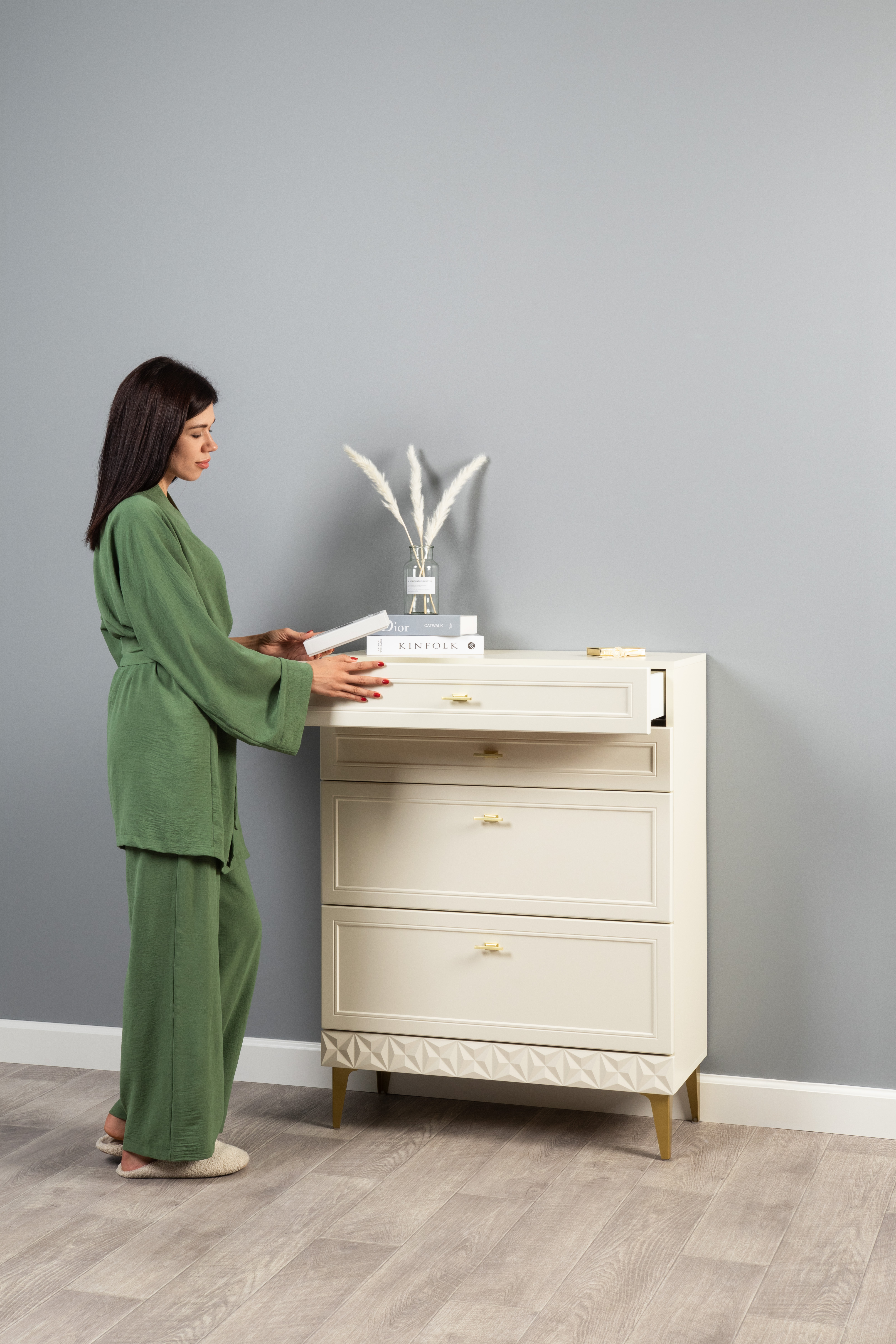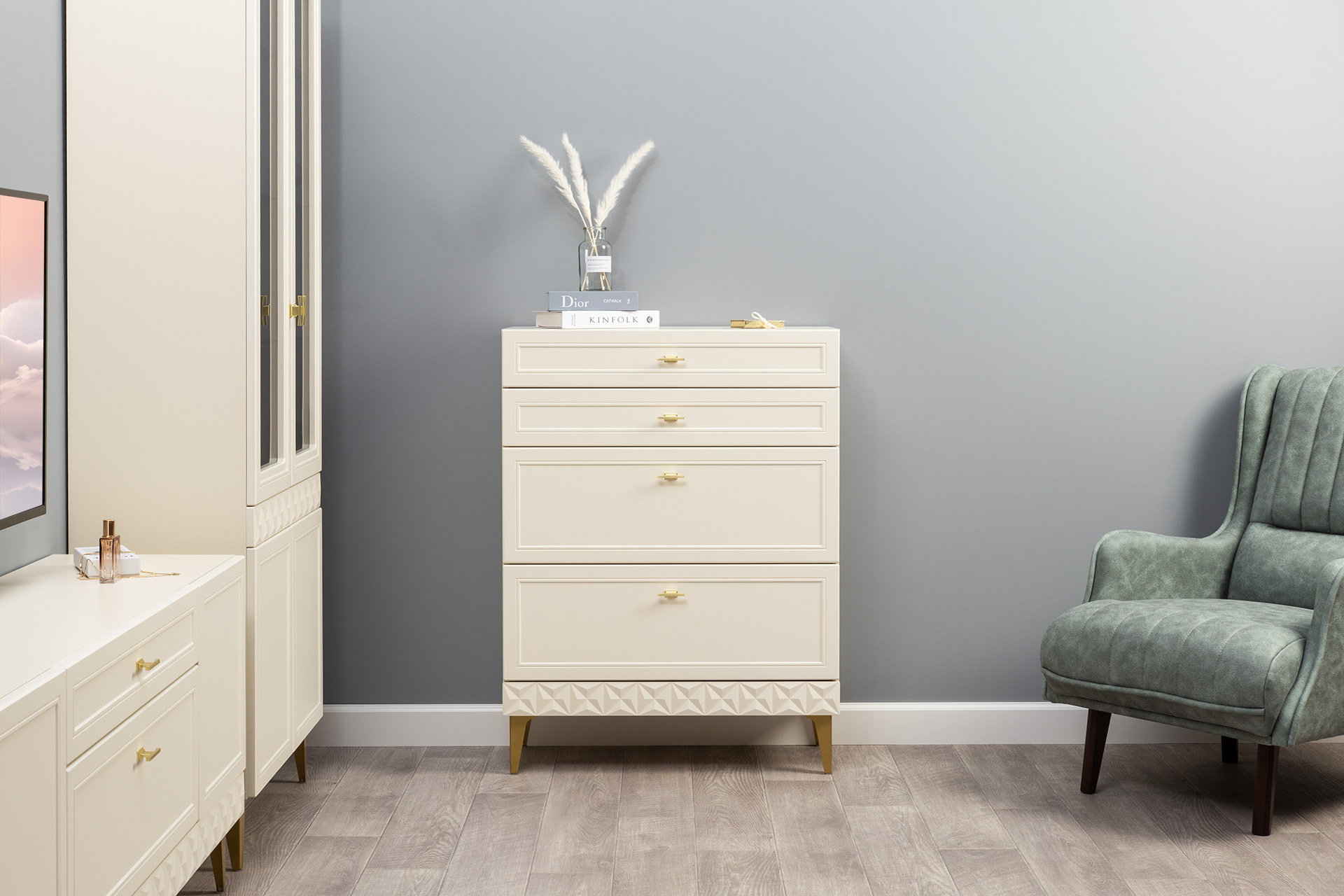 Комод Марион 16.249 дымчатый зеленый K521, олива шагрень AG 1050 ПВХ, белый PE шагрень