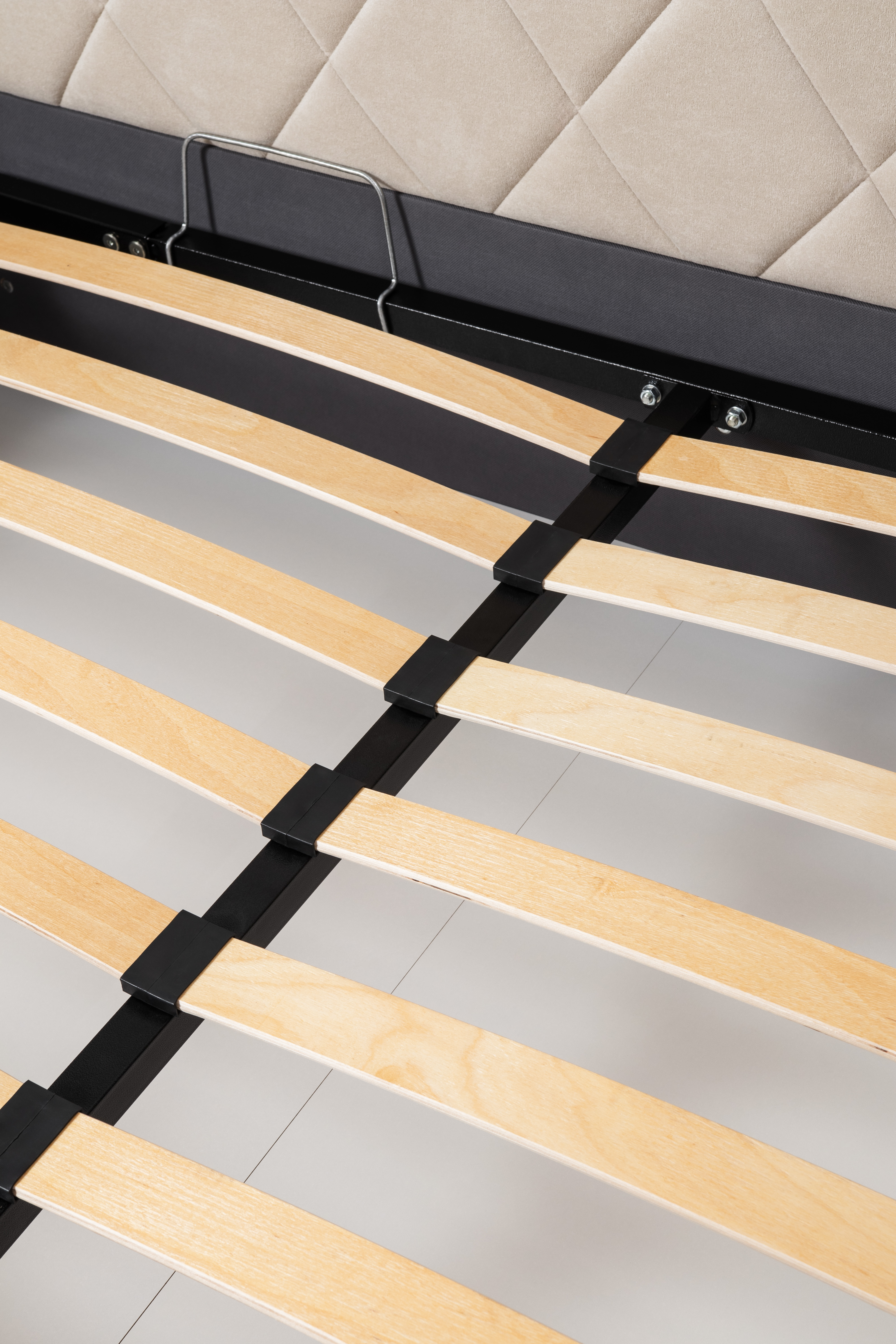 Основание кровати укомплектовано матрасодержателями. Жесткое кроватное дно из ЛДСП 16 мм на опорах 25 мм.