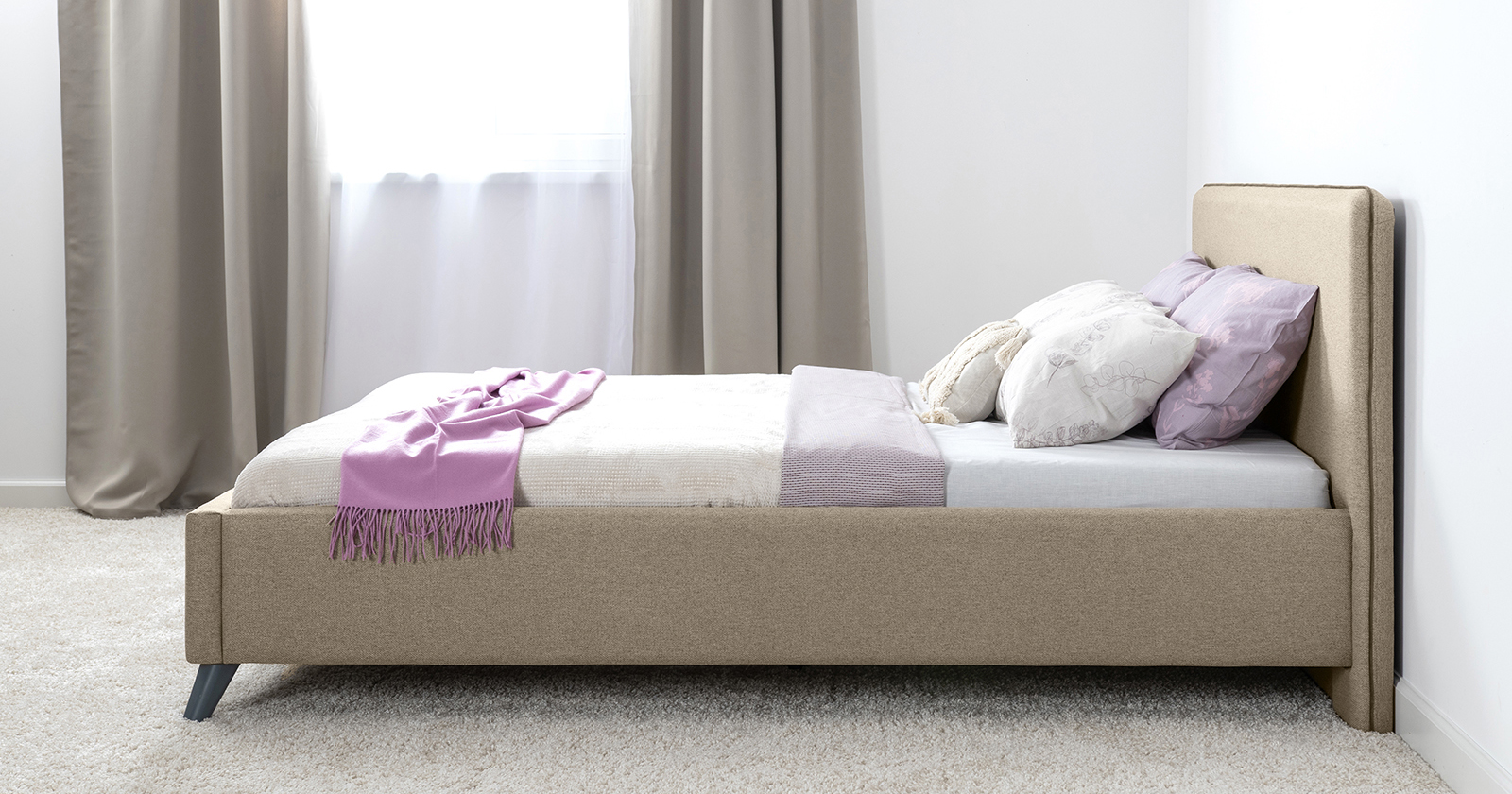 Кровать Миа 140 рогожка светло-бежевый, кант желтовато-коричневый с ортопедическим основанием и подъемным механизмом