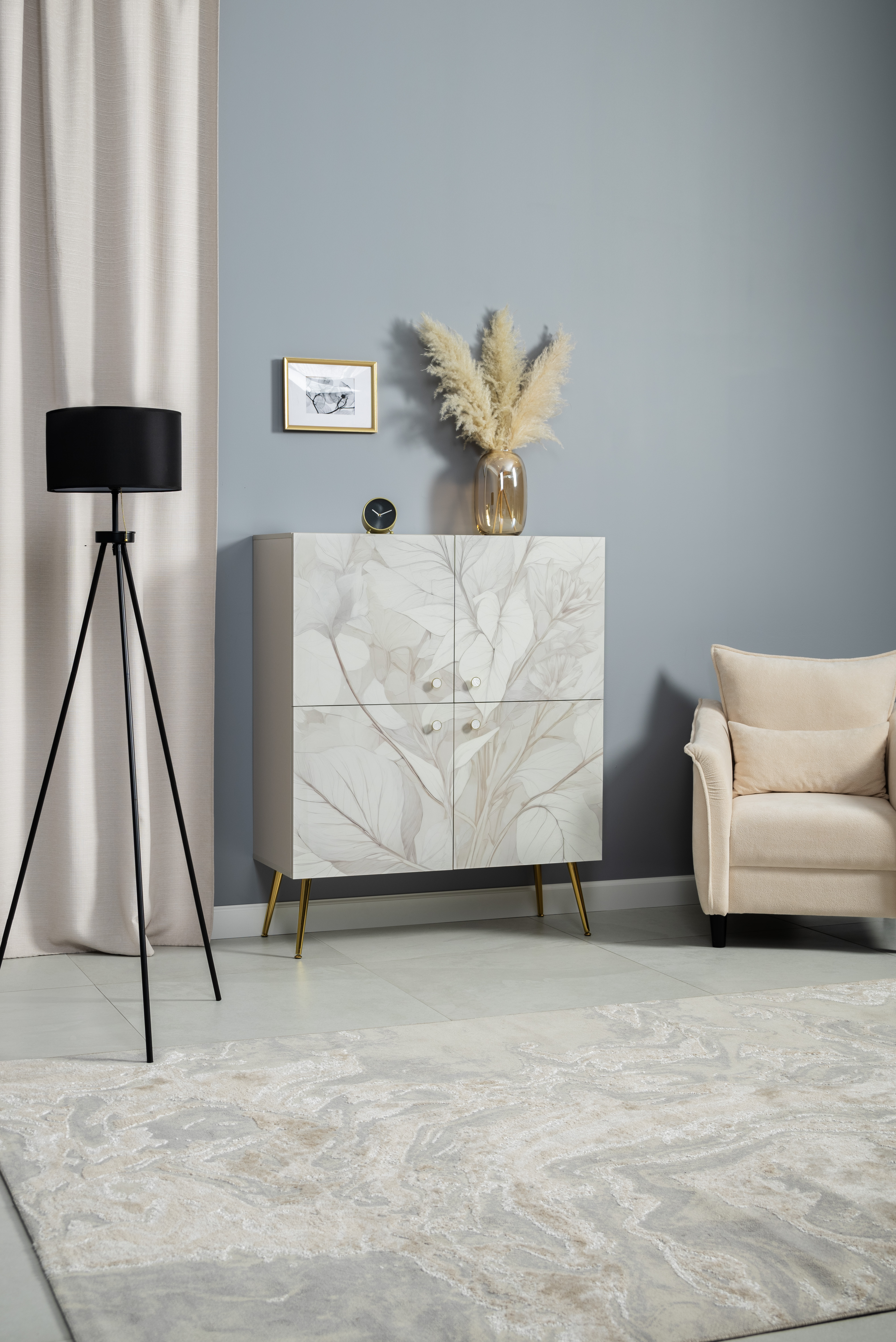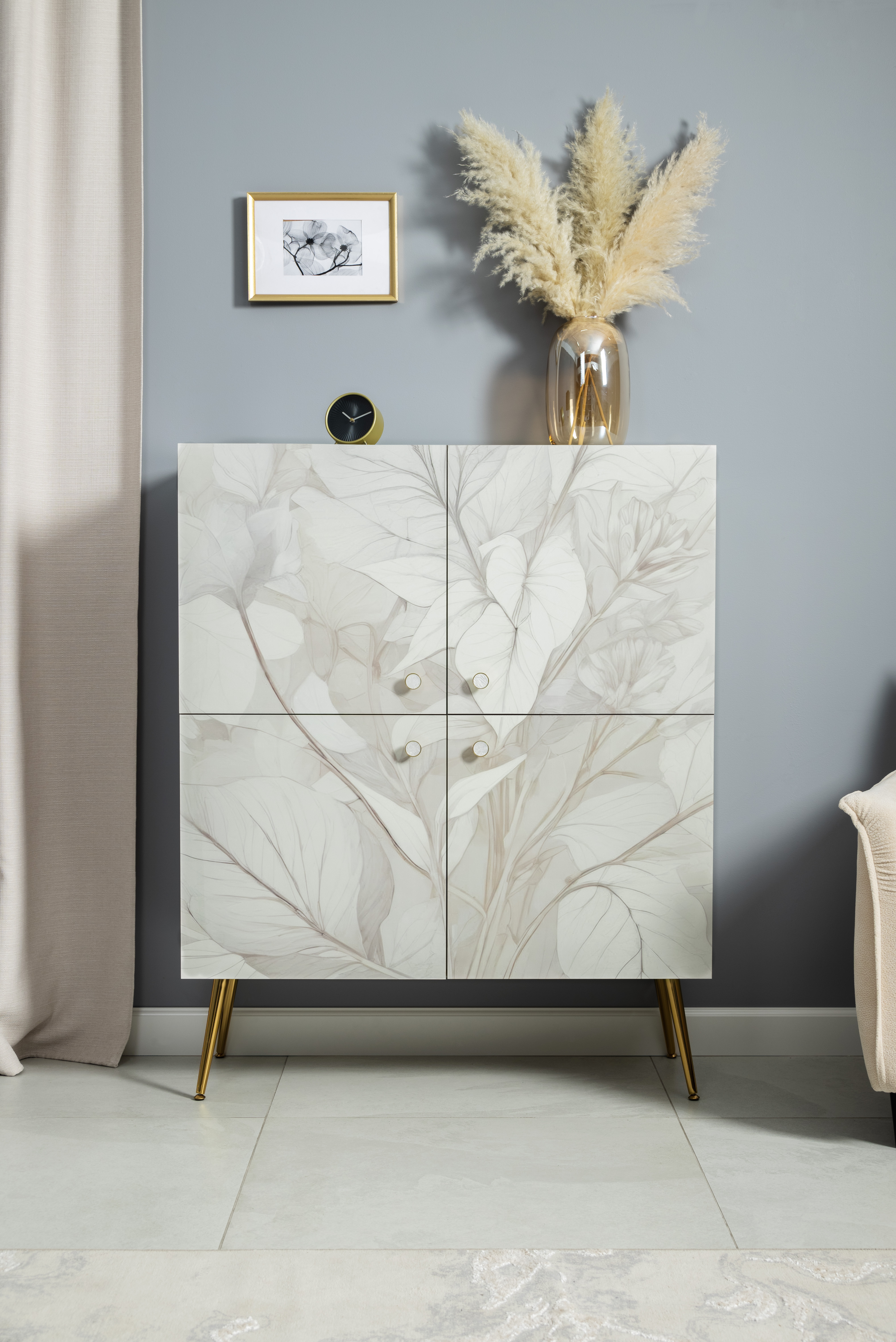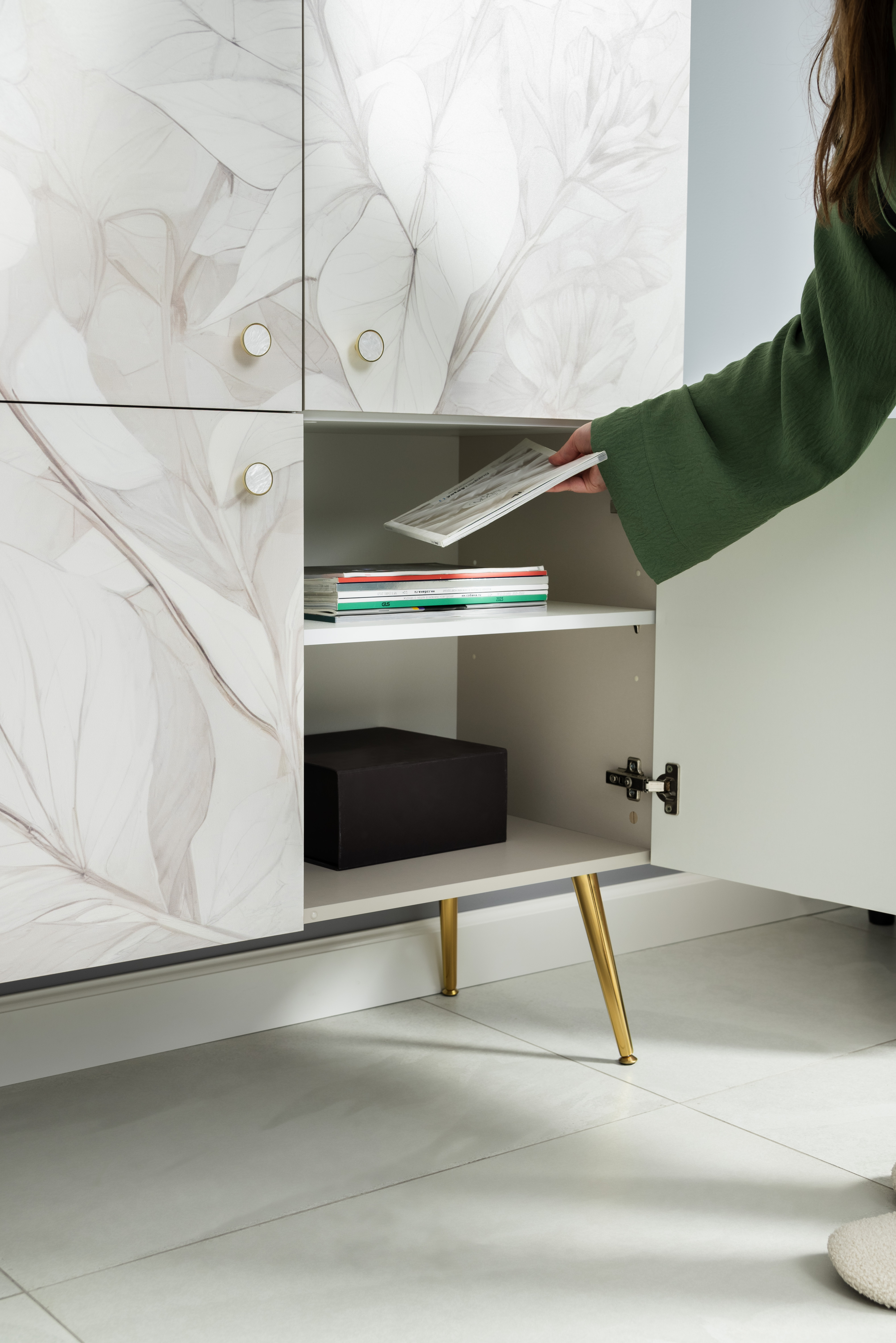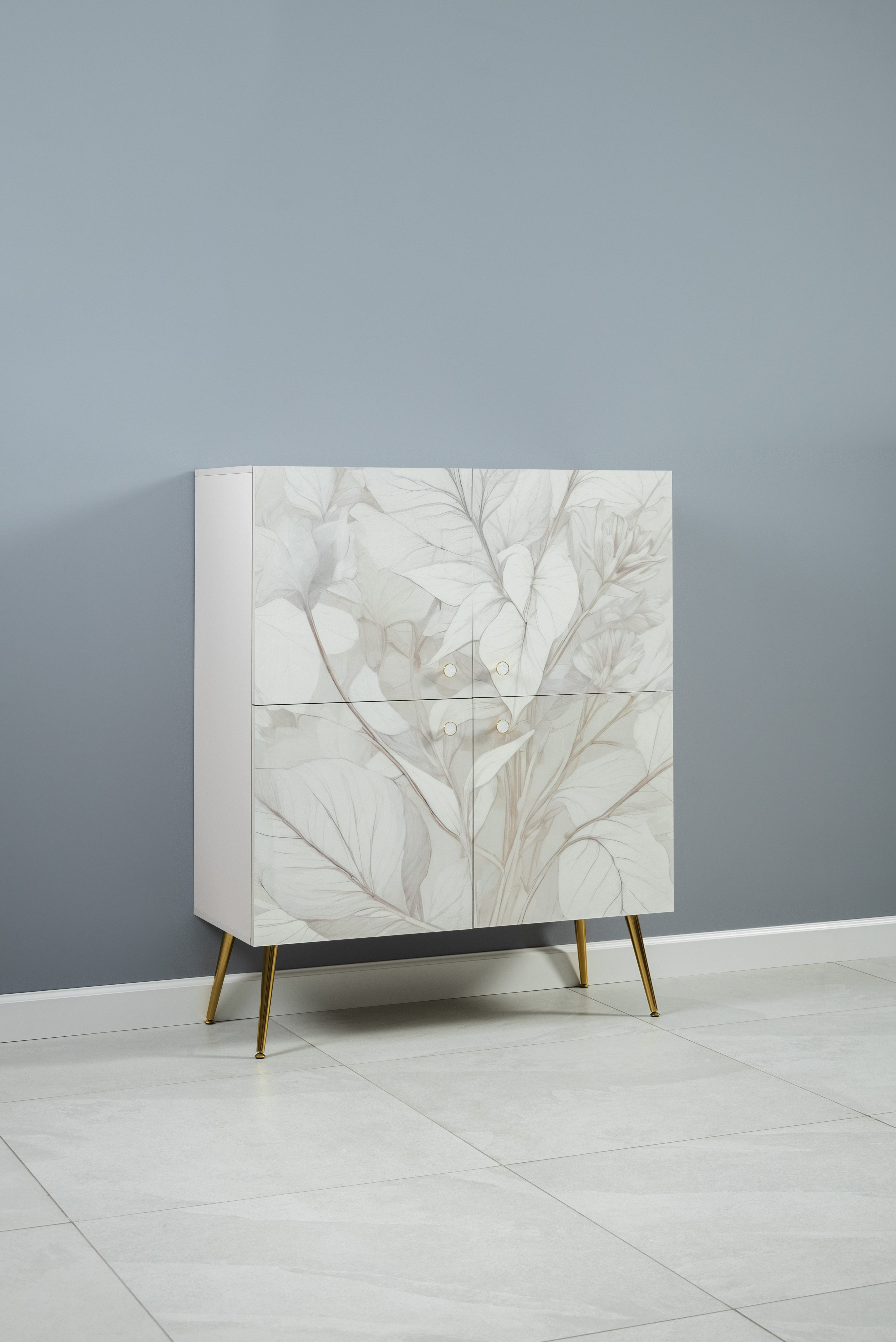 Шкаф Флоу 16.329 выделяется растительным принтом на фасаде, создающими свежий и стильный акцент в интерьере. Металлические ручки и опоры с регулировкой придают конструкции надежность и современный вид. Вместительные отделения, петли с доводчиком и скрытая задняя стенка обеспечивают удобство хранения и аккуратный внешний вид.