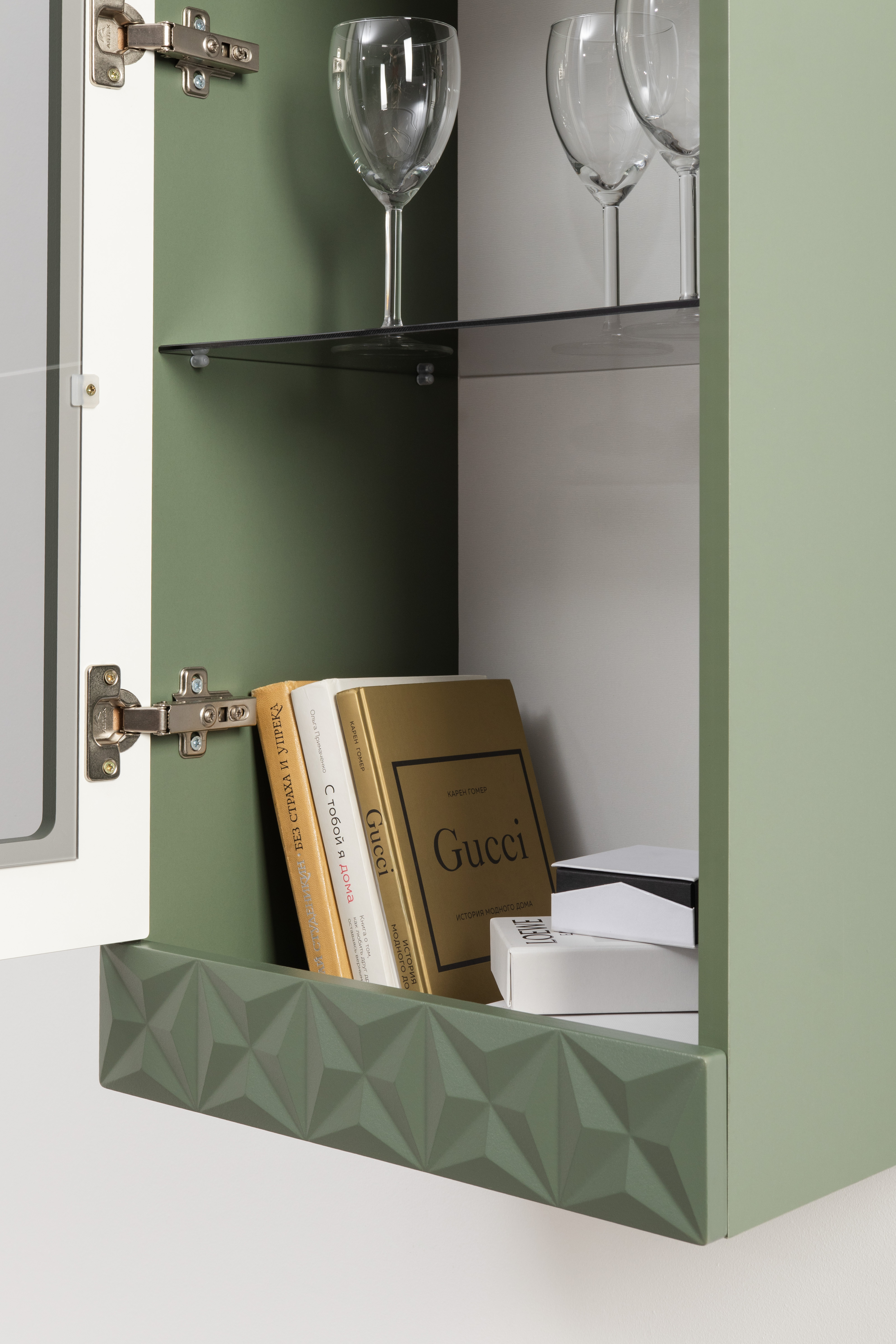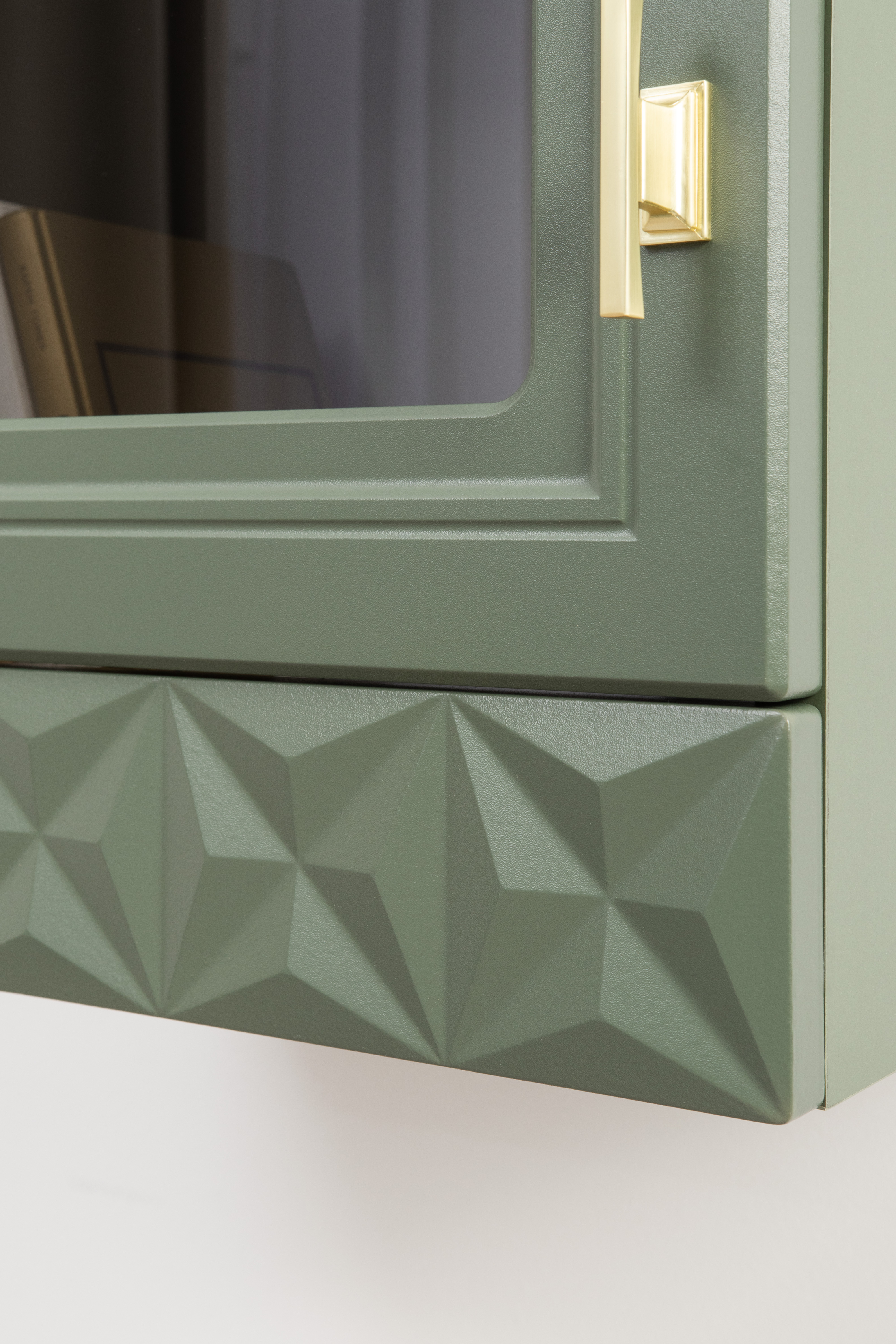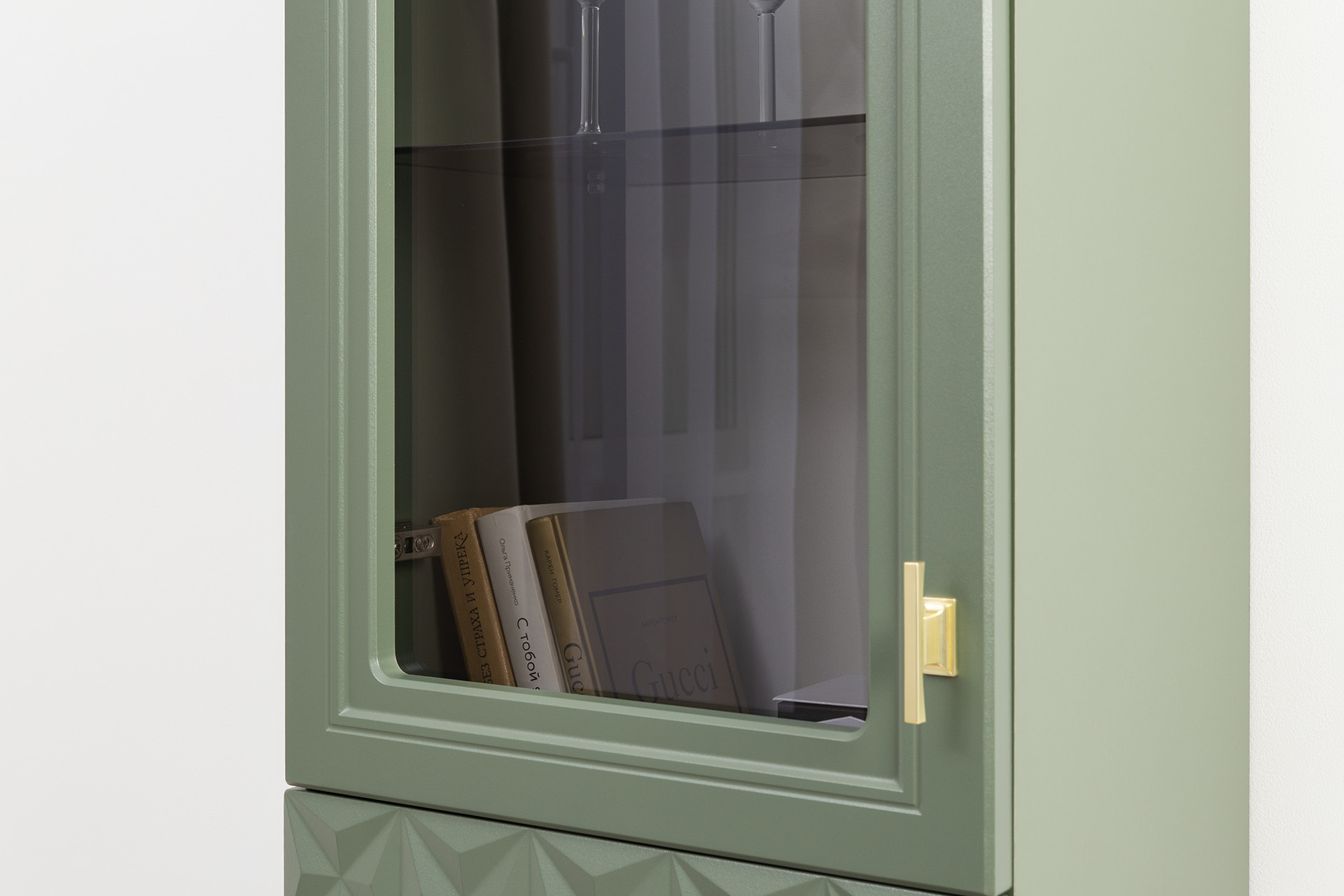 Шкаф-витрина Марион 16.397.02 дымчатый зеленый K521, олива шагрень AG 1050 ПВХ
