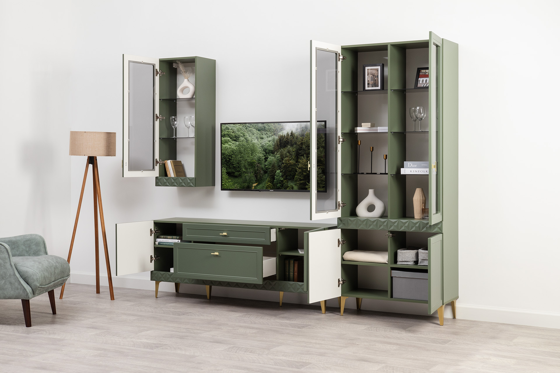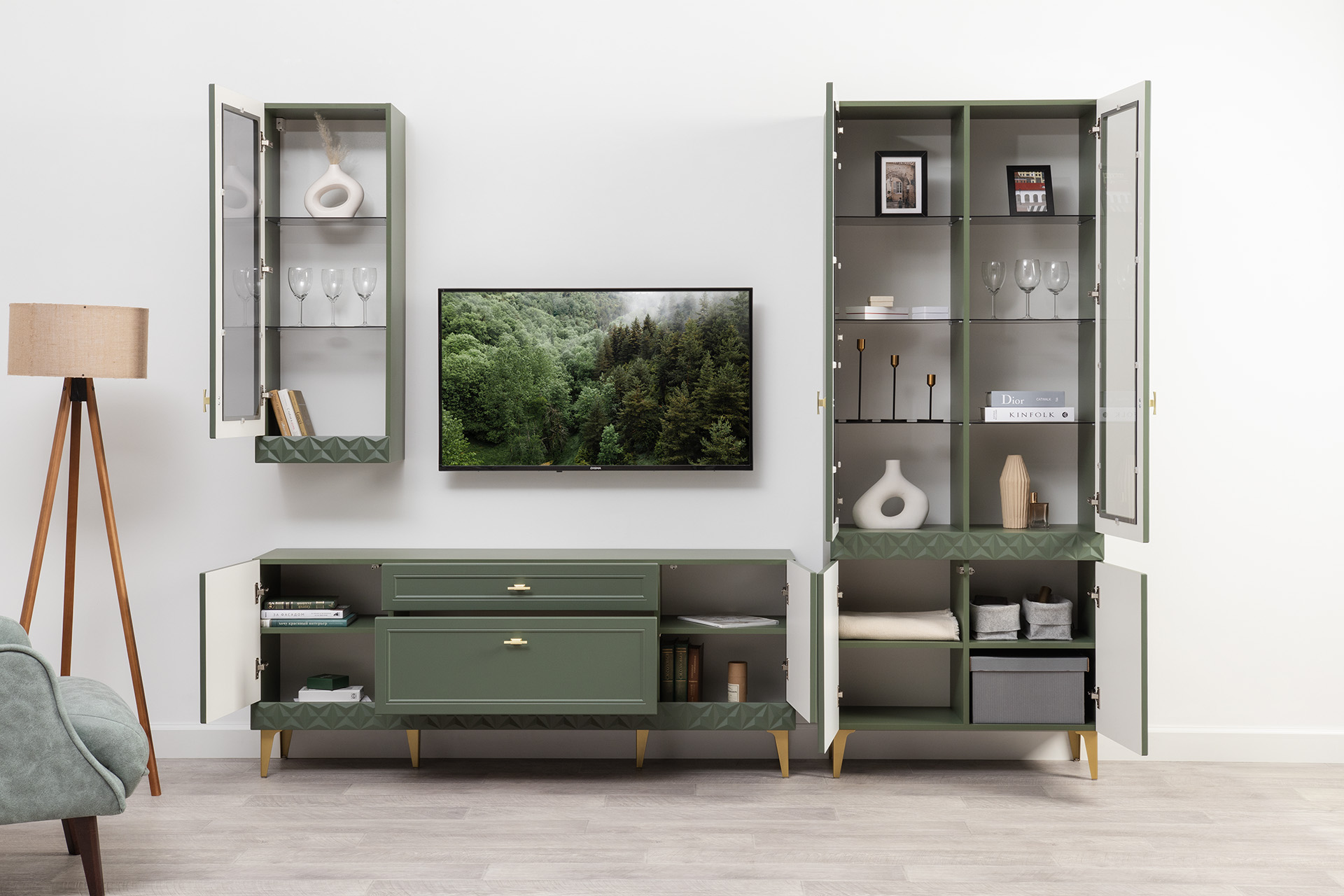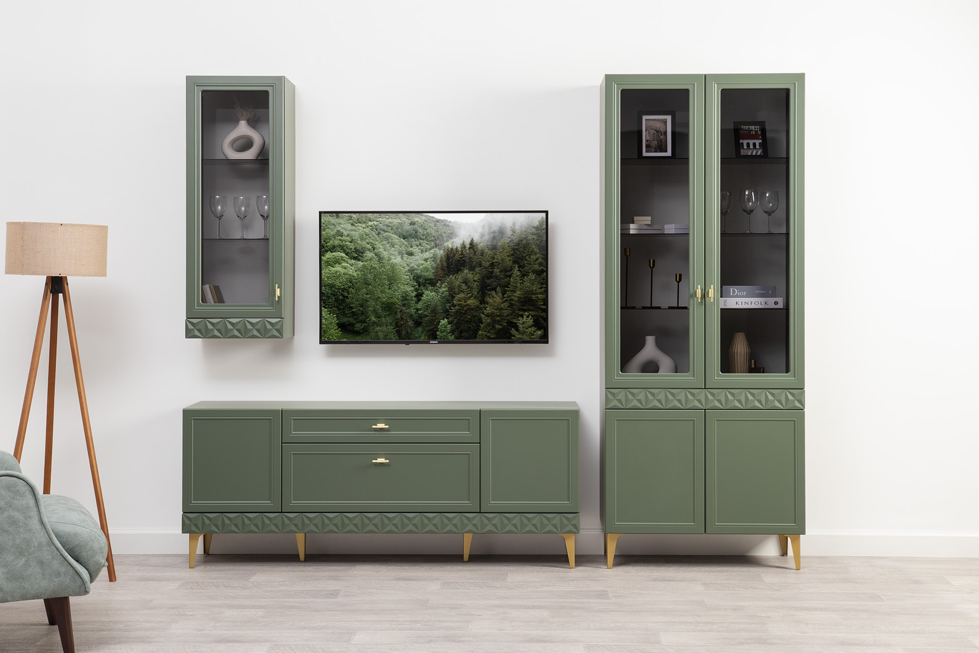Шкаф-витрина Марион 16.397.02 дымчатый зеленый K521, олива шагрень AG 1050 ПВХ