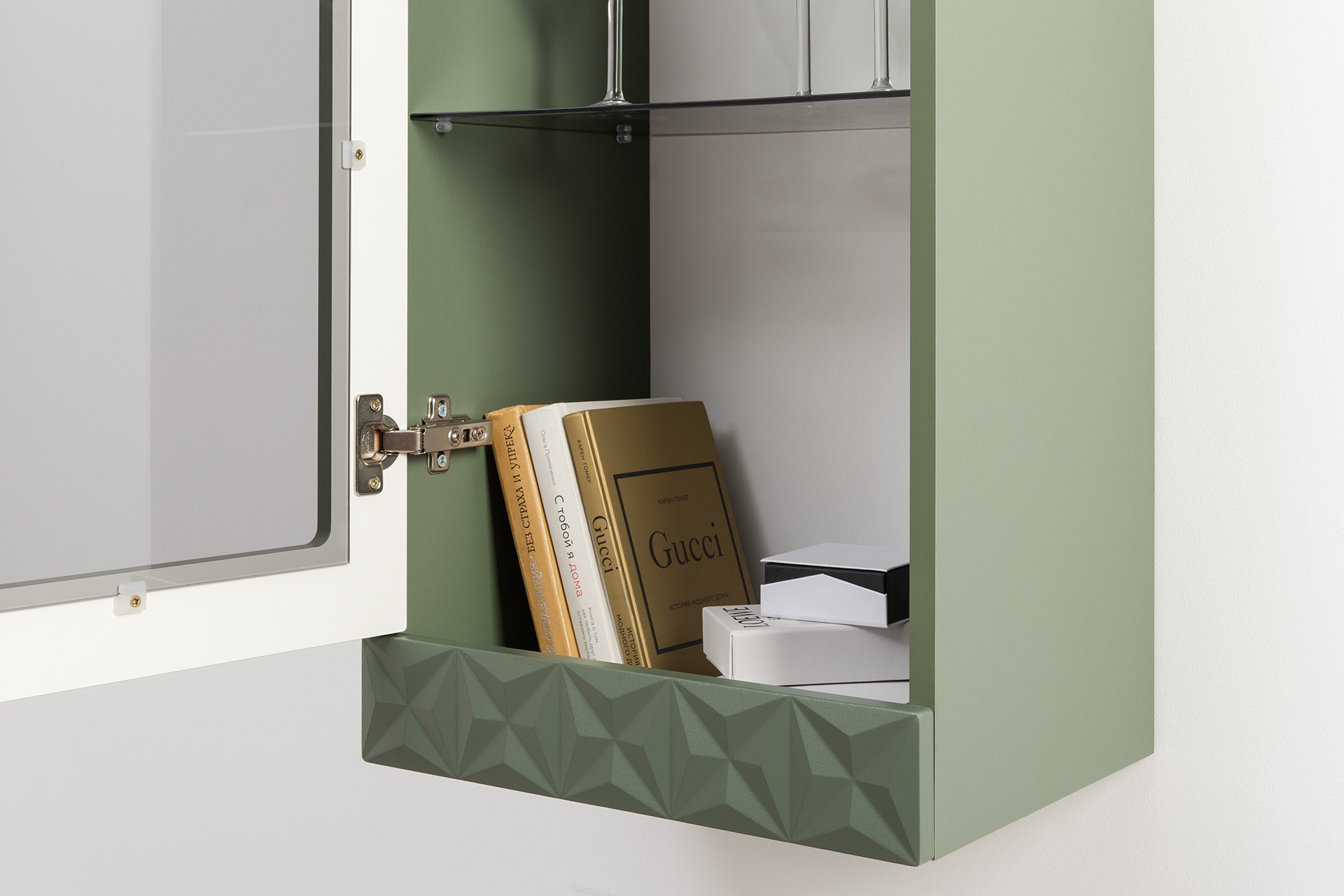 Шкаф-витрина Марион 16.397.01 дымчатый зеленый K521, олива шагрень AG 1050 ПВХ (собирается на любую сторону)