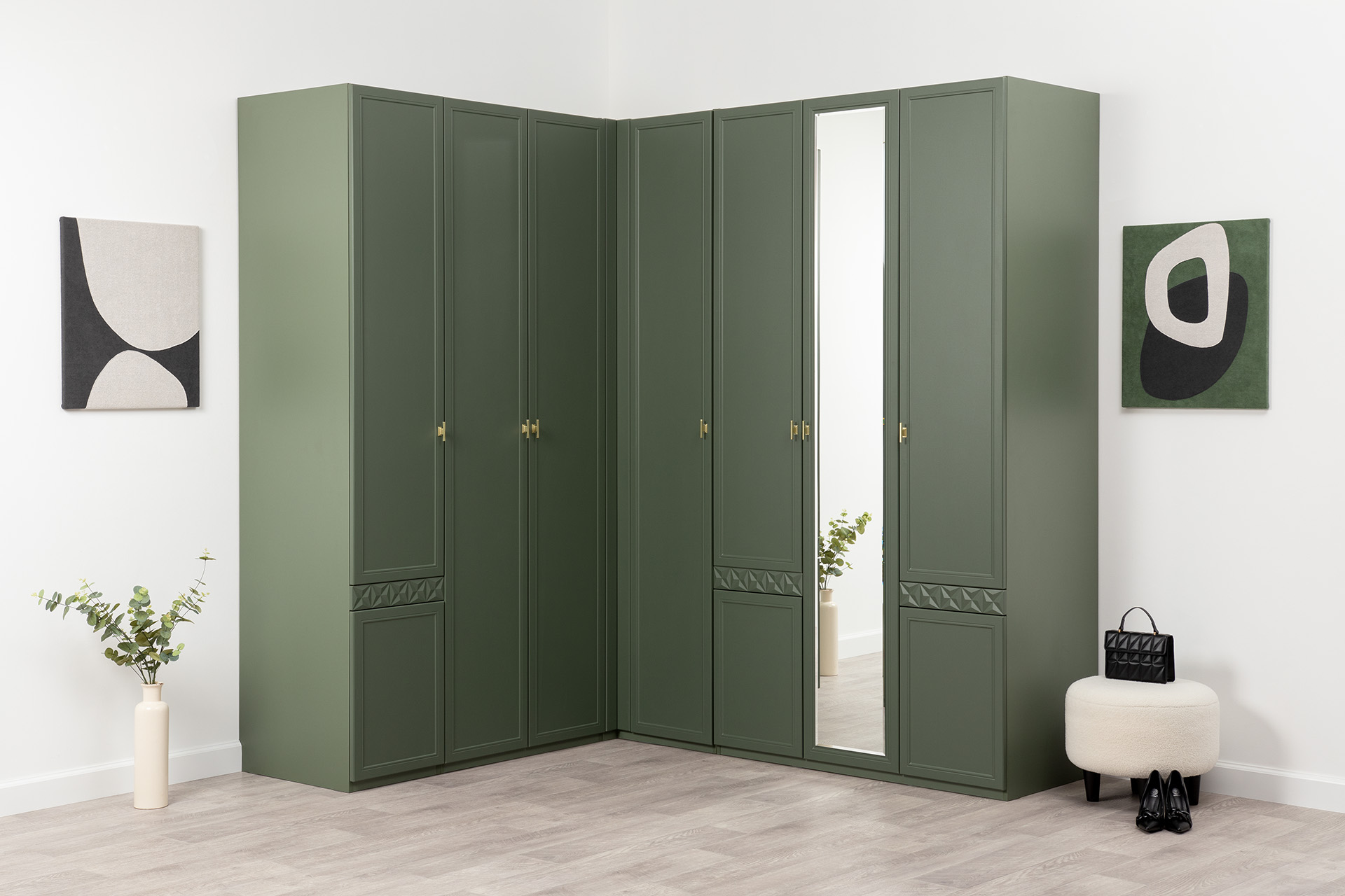 Шкаф угловой Марион 16.339 дымчатый зеленый K521, олива шагрень AG 1050 ПВХ (собирается на любую сторону)