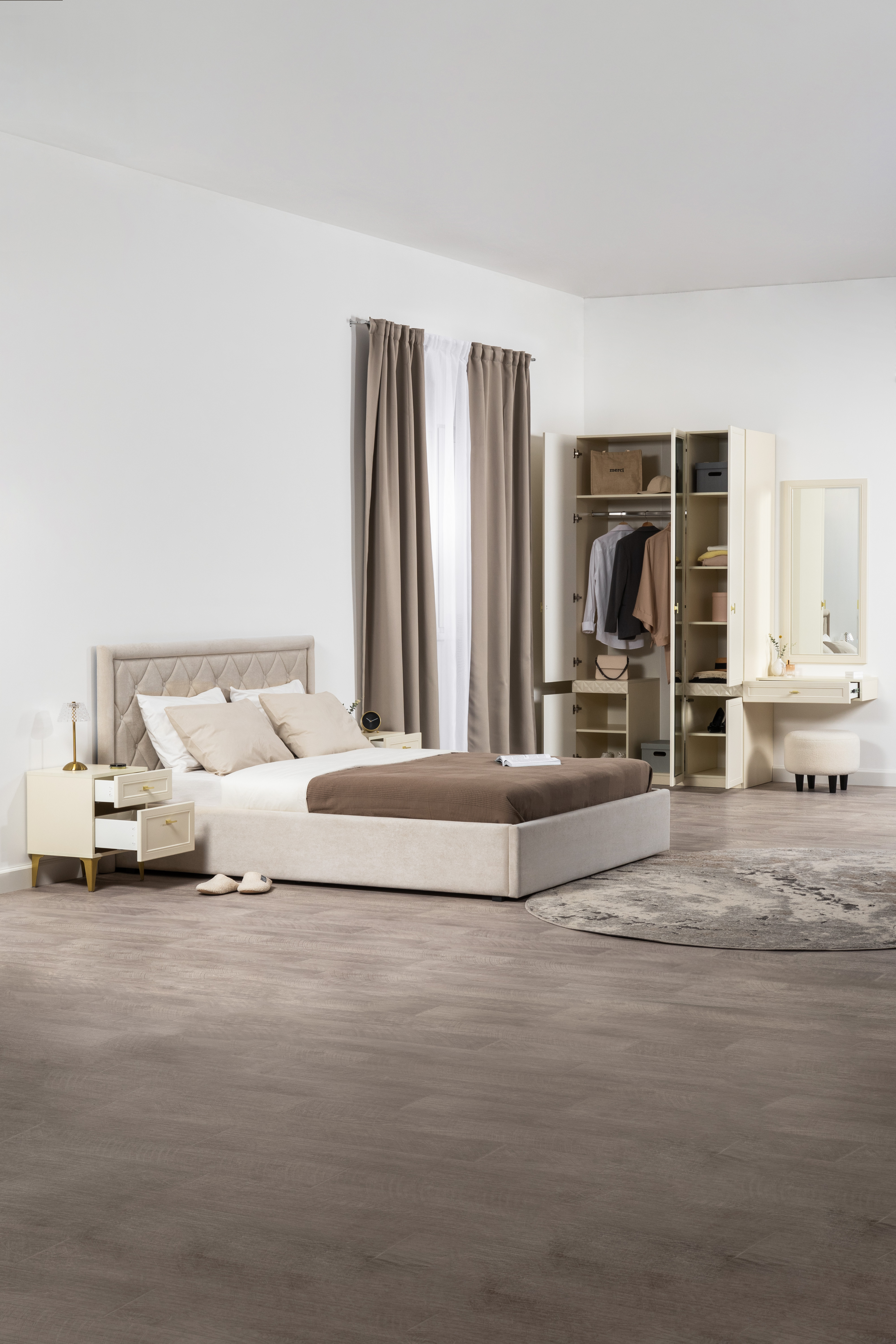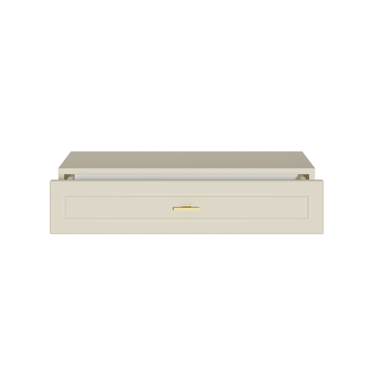 Изящные линии, глубокая фрезеровка фасадов из МДФ и благородные оттенки. Утончённая «Слоновая кость» и изысканная «Олива Шагрень» с глубоким зелёным тоном — создают атмосферу уюта, тепла и благородства. Металлические ручки и опоры золотого цвета придают мебели утончённый блеск, а петли и направляющие с доводчиками обеспечивают плавное и бесшумное закрытие фасадов.